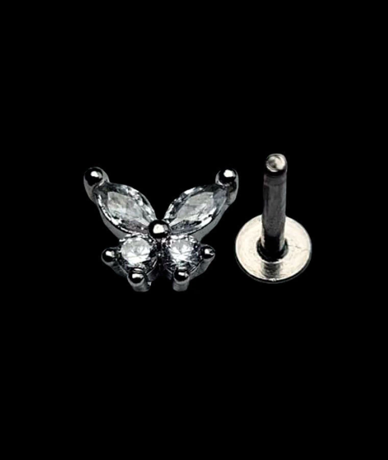 Piercing labret em aço cirúrgico na cor prata, resistente e sofisticado, com ponta em formato de borboleta delicadamente com cristais de luz que irradiam brilho a cada movimento. A peça une leveza e encanto, simbolizando transformação e liberdade, tornando-se o acessório perfeito para quem deseja destacar sua beleza com um toque romântico e cheio de personalidade.